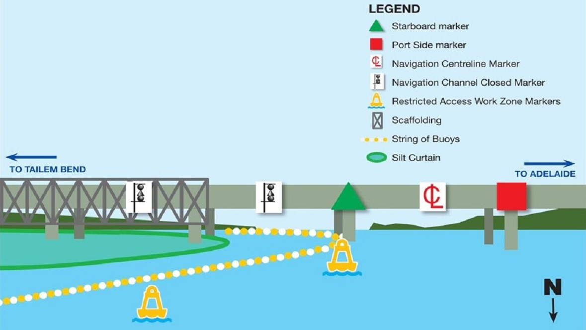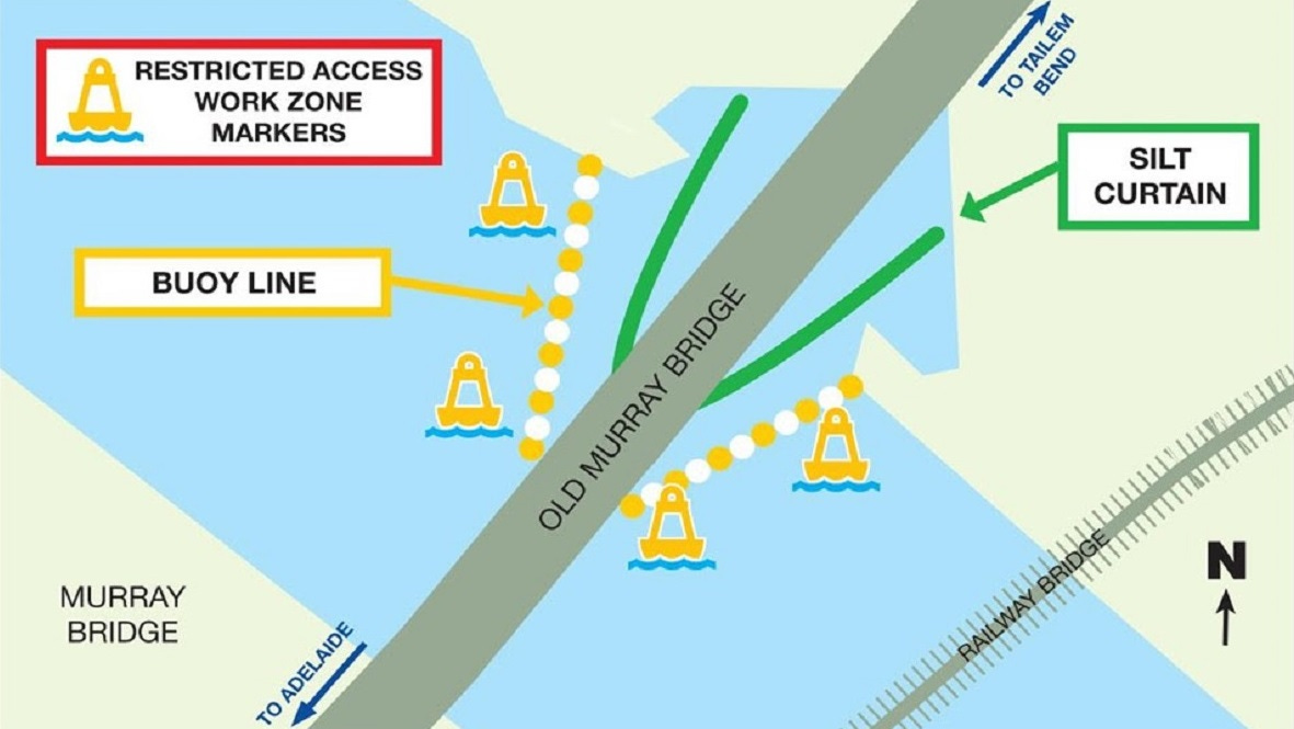 Navigation channels under the old Murray Bridge will be redirected for eight months to create a temporary work zone as work continues on its refurbishment.